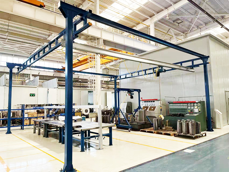 孚尔特组合式自立起重机,型号: MLCSLX - FS -250-7(2)-28-3, MLCSL - FS -500-9.7(2)-23.5-3。 X - Y 方向均为手动运行,升降采用双速环链电动葫芦配合。为何择孚尔特